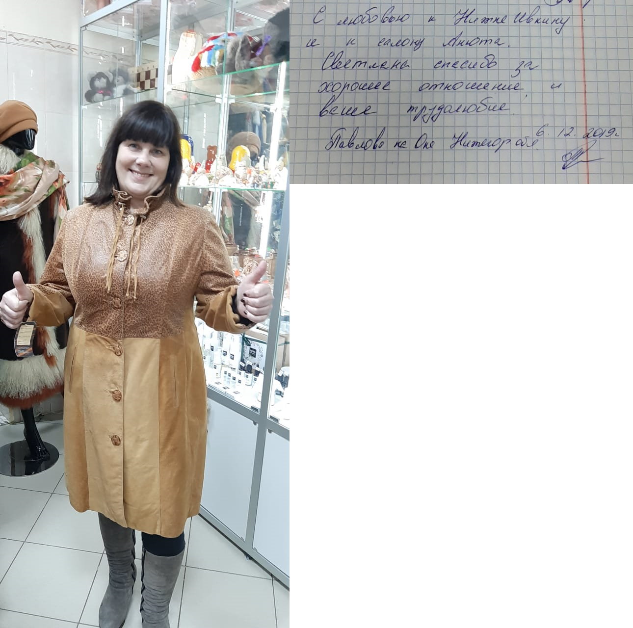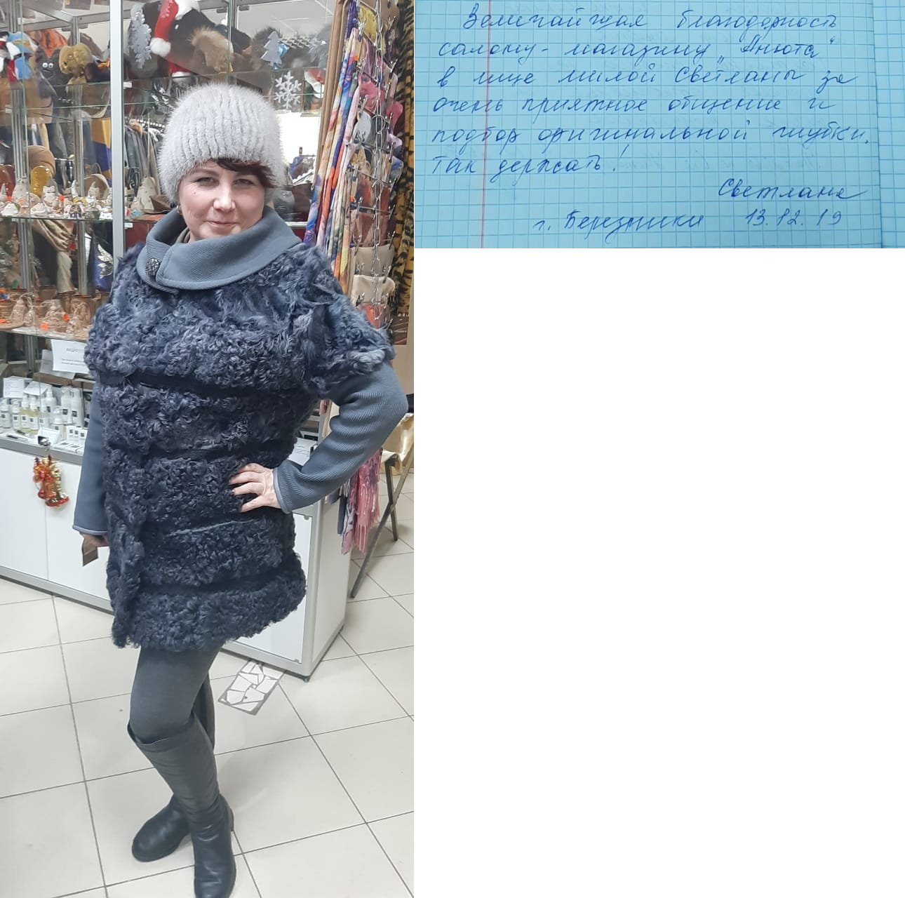 Елена ВязниковаБольшое спасибо за легкую, теплую, качественную шубку. Мечтала давно. Мечта сбылась. Большое спасибо. Творческих успехов. |