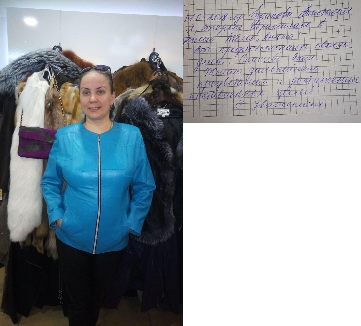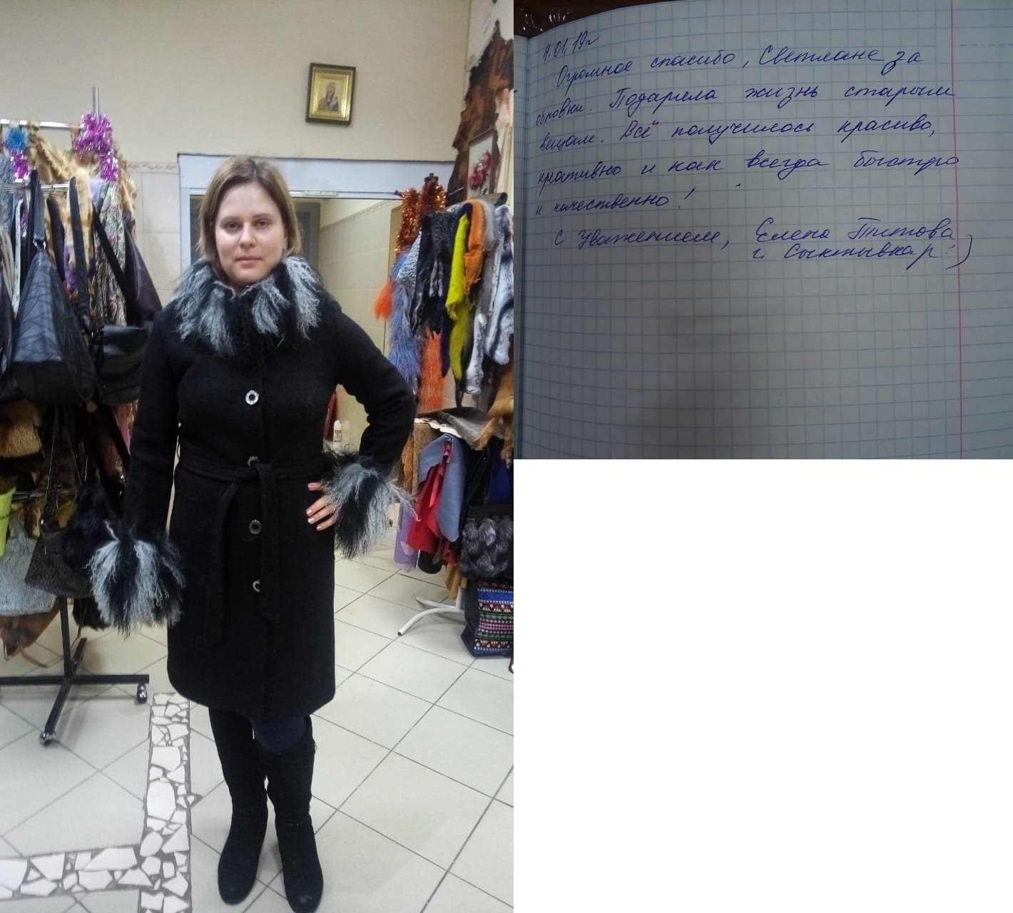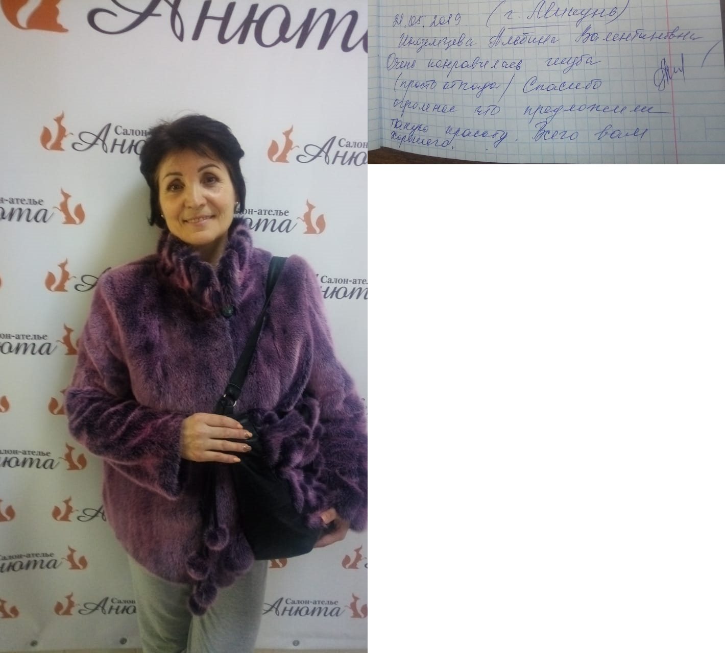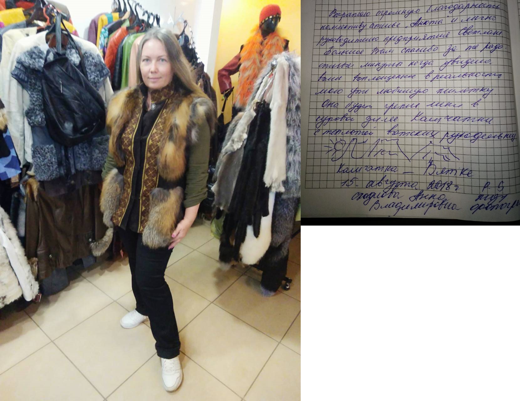 Добрый вечер! Высылаю Вам отзыв: Недавно побывала в салоне «Анюта» и заказала сшить шубу. Сотрудники салона «Анюта» очень вежливые, общительные и внимательные. Сразу помогли мне с выбором шубы. Очень довольна покупкой, порадовало качество изделия и уровень обслуживания покупателя. Все прошито идеально, ничего не торчит. Мех отличный густой. Мне в ней очень комфортно. Светланы Елсукова — профессионал своего дела. Хочу пожелать вам процветания и хорошей торговли. Буду советовать Вас. И непременно в дальнейшем буду пользоваться услугами вашего салона. Большое Вам спасибо за красоту! |