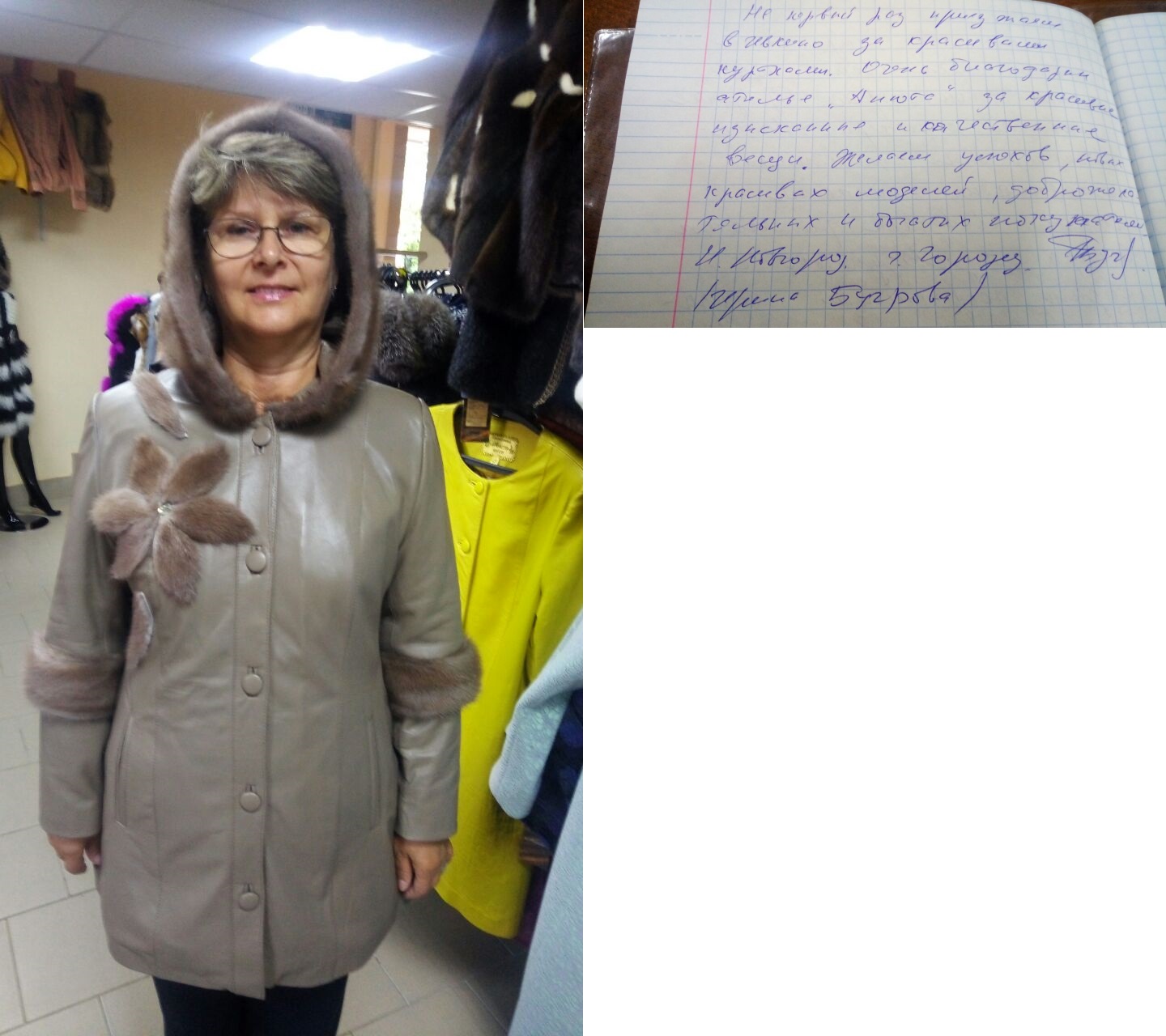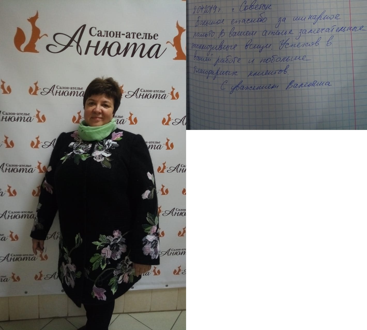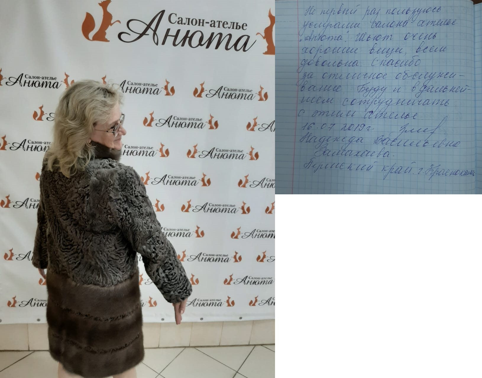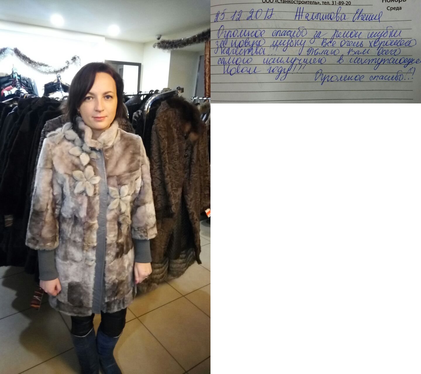 Добрый вечер! Высылаю Вам отзыв: Недавно побывала в салоне «Анюта» и заказала сшить шубу. Сотрудники салона «Анюта» очень вежливые, общительные и внимательные. Сразу помогли мне с выбором шубы. Очень довольна покупкой, порадовало качество изделия и уровень обслуживания покупателя. Все прошито идеально, ничего не торчит. Мех отличный густой. Мне в ней очень комфортно. Светланы Елсукова — профессионал своего дела. Хочу пожелать вам процветания и хорошей торговли. Буду советовать Вас. И непременно в дальнейшем буду пользоваться услугами вашего салона. Большое Вам спасибо за красоту! |