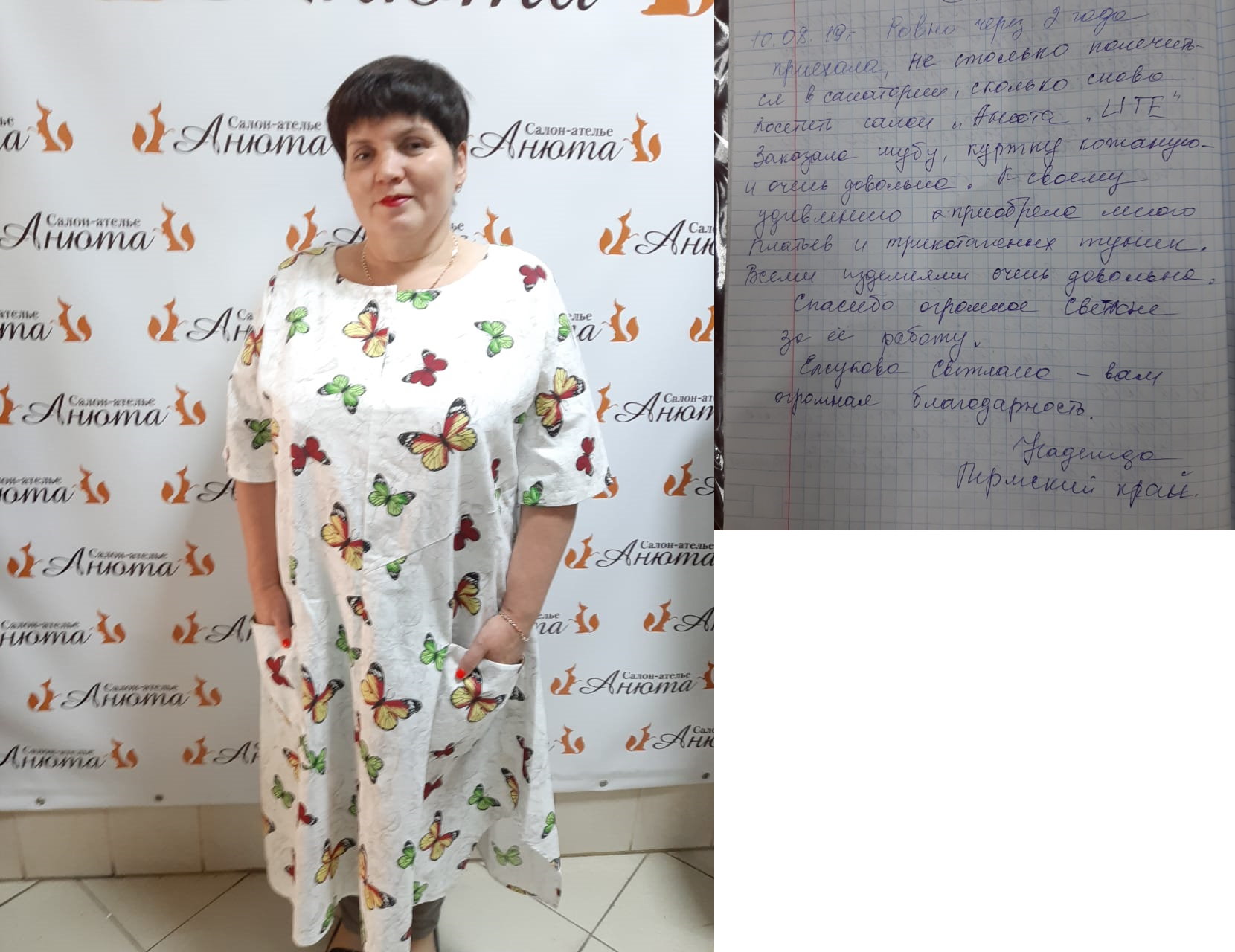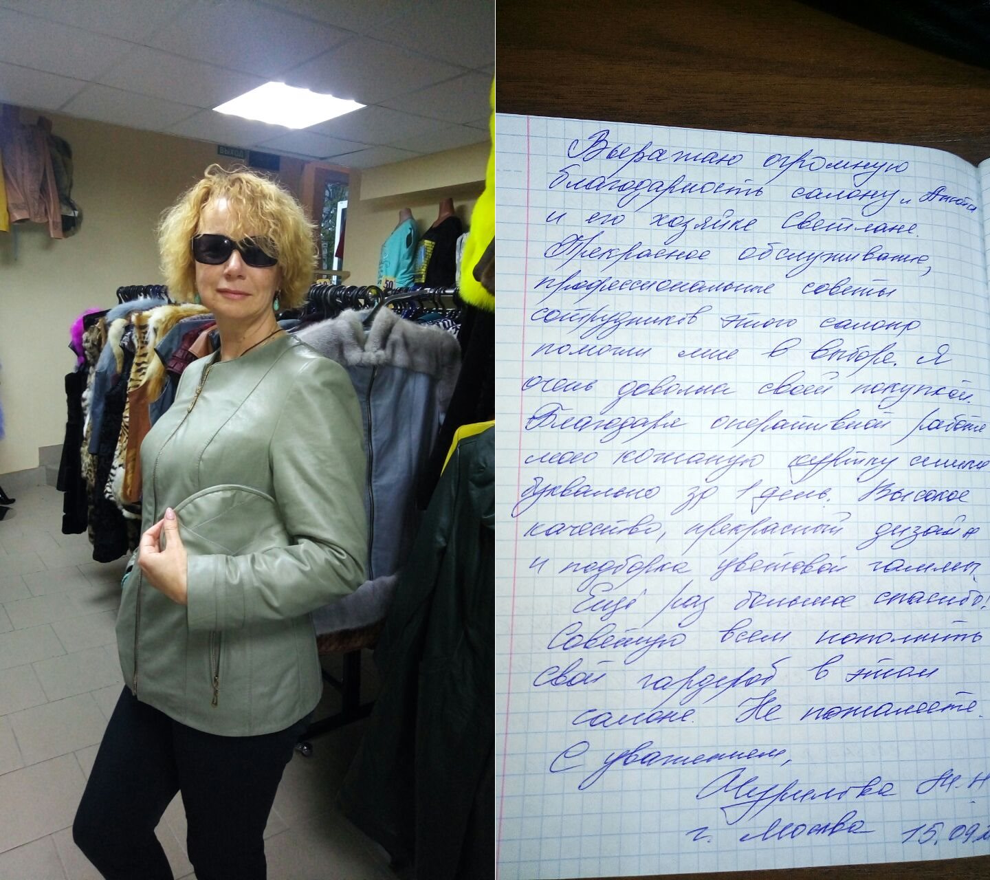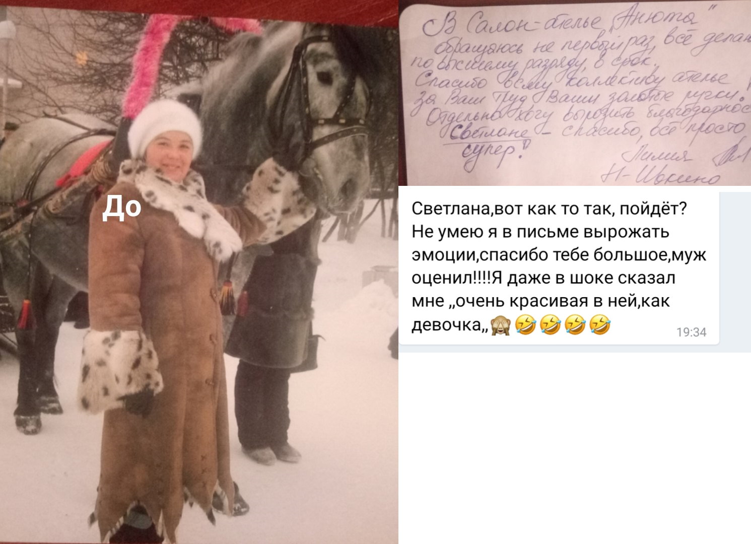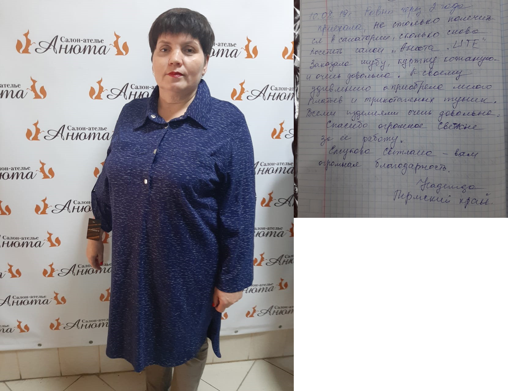 Добрый вечер! Высылаю Вам отзыв: Недавно побывала в салоне «Анюта» и заказала сшить шубу. Сотрудники салона «Анюта» очень вежливые, общительные и внимательные. Сразу помогли мне с выбором шубы. Очень довольна покупкой, порадовало качество изделия и уровень обслуживания покупателя. Все прошито идеально, ничего не торчит. Мех отличный густой. Мне в ней очень комфортно. Светланы Елсукова — профессионал своего дела. Хочу пожелать вам процветания и хорошей торговли. Буду советовать Вас. И непременно в дальнейшем буду пользоваться услугами вашего салона. Большое Вам спасибо за красоту! |