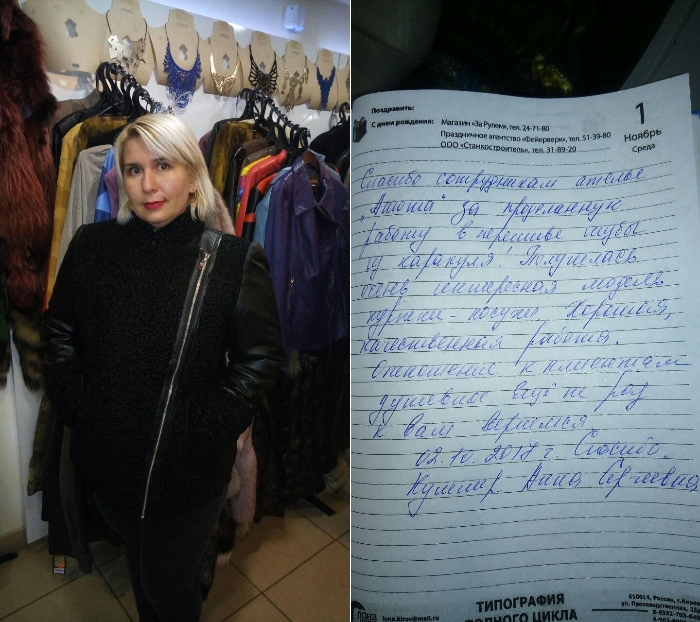Людмила, г. КировХочу поблагодарить и сказать огромное спасибо за новую шубу сотрудников ателье "Анюта", особенно Елсукову Светлану. Приятно встретить понимание и внимание к желаемым моментам и требованиям в обновке. За такое тёплое отношение. Ещё не раз захочется придти и ознакомиться с ассортиментом, который и сейчас широк. Спасибо, и удачи вам. Любимое г. Киров. |