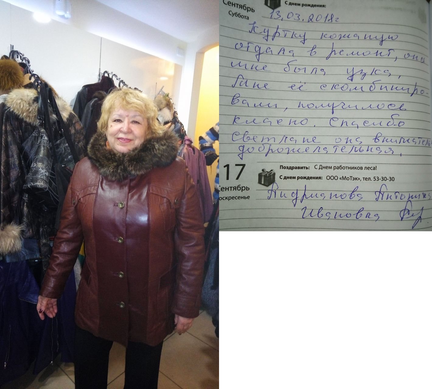 Семакова Ирина НиколаевнаВыражаю благодарность за перешив шубы. Все получилось красиво, удобно и современно. Желаю коллективу процветания и дальнейших творческих успехов. Поздравляю всех с наступающим 2017 годом. Заказчик Семакова Ирина Николаевна 17.12.16г. |