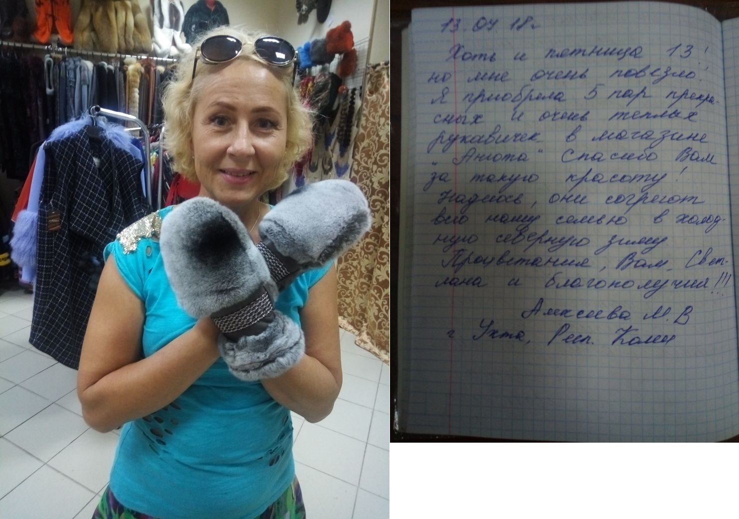 Романова Надежда Петровна, г. МоскваВторой день на выставке, и второй год покупаю только Вашу замечательную продукцию, ношу с удовольствием! Работа дизайнеров чувствуется в каждом изделии, выбор большой, а значит и выбрать сложнее, зато каждая красавица может удовлетворить индивидуально свои желания. Ваши изделия радуют глаз и согревают не только тело, но и душу! Спасибо Вам за Ваш труд, за Ваше стремление радовать нас- женщин! Особое внимание и свою благодарность хочу высказать Светланочке! У нее дар работать с людьми!!! 2017 год. 16 февраля |