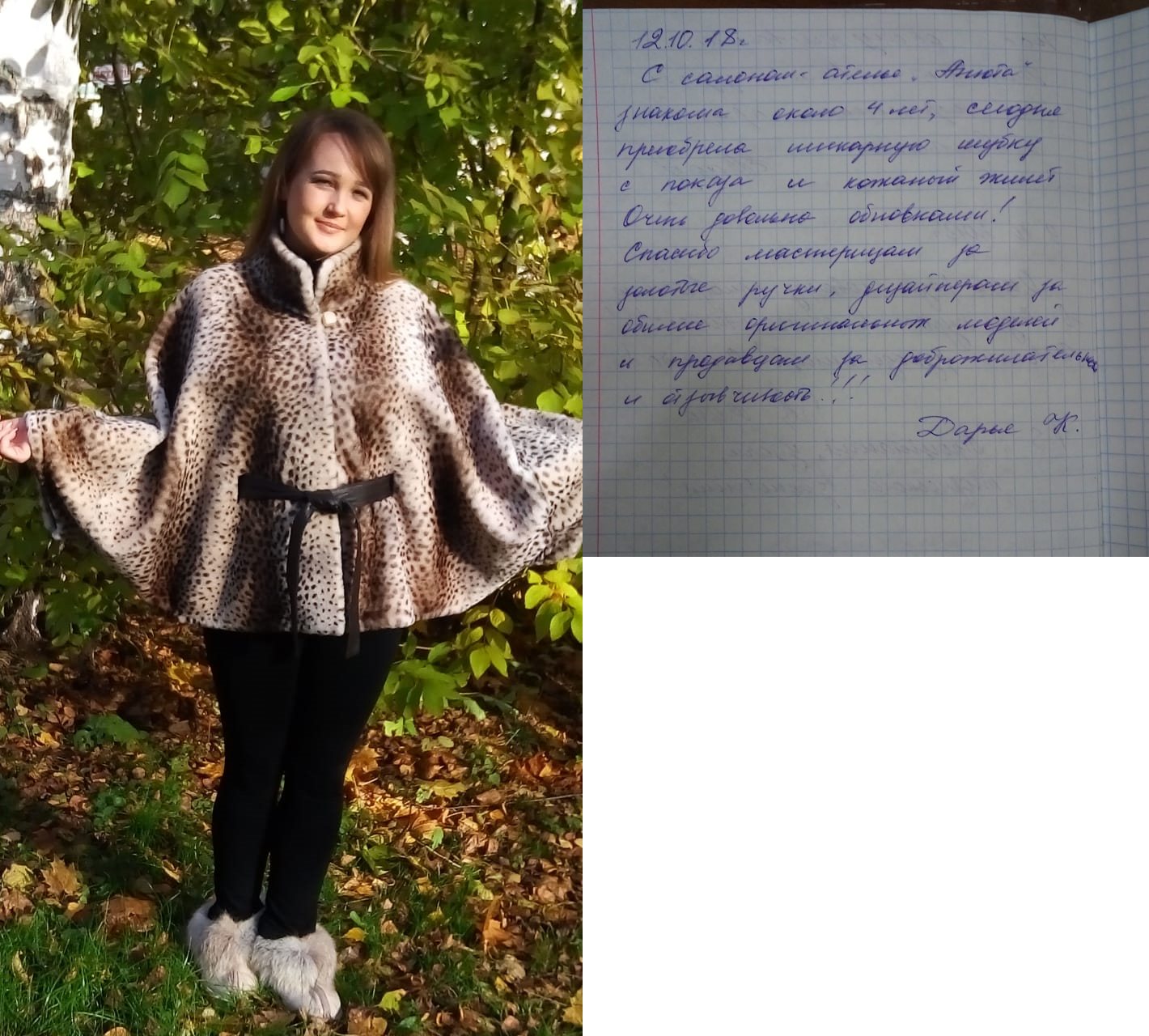 Ирина, г. КировУра! 2-я жизнь моей любимой шубы из белки! Буду носить еще лет 20! Приходите в «Анюту»! Очень здорово! Девочки помогут во всем и подарят хорошее настроение и почти обновку!!! |