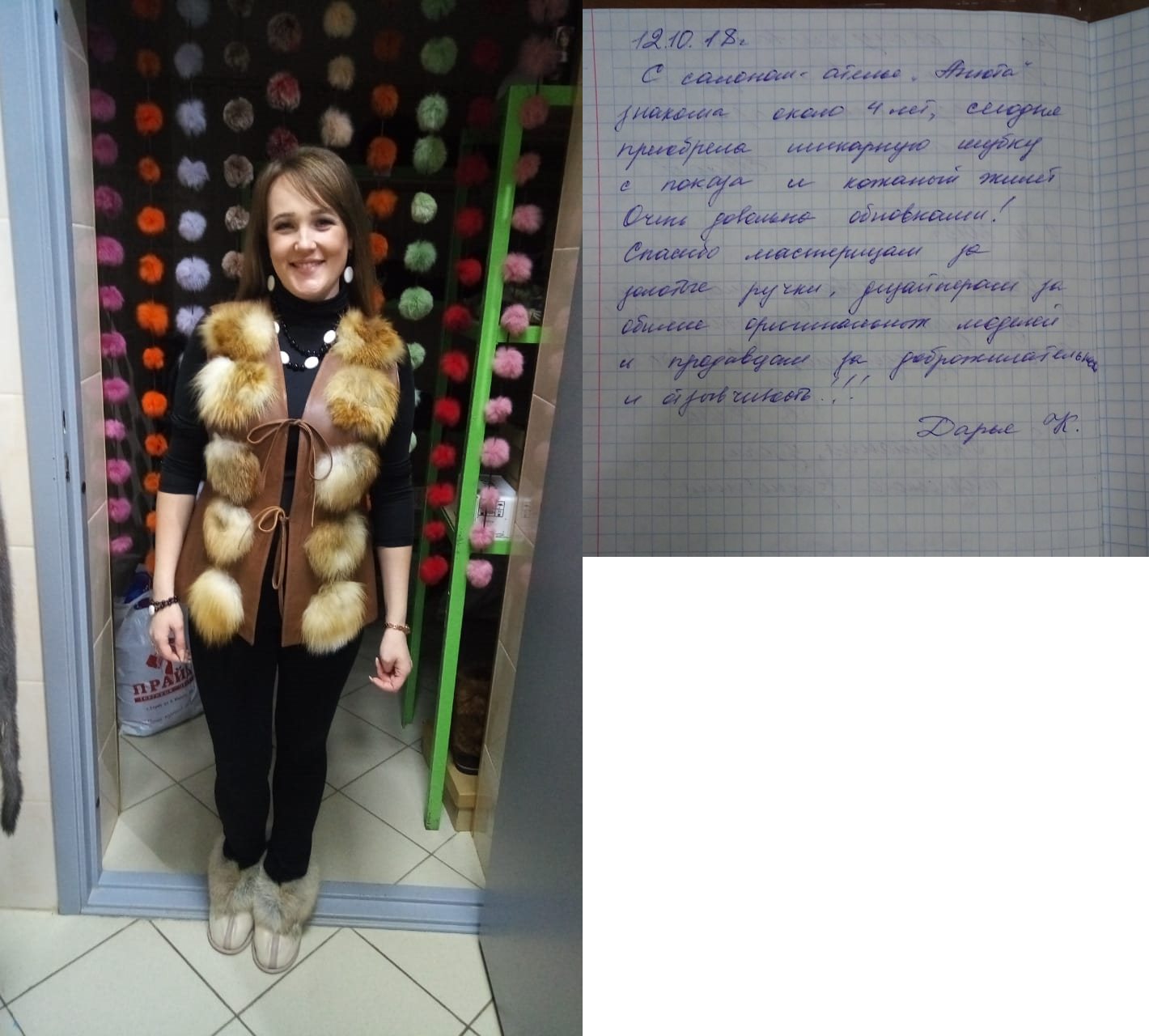 22.09.2017Приобрела в салоне «Анюта» шубу и жилетку! Очень довольна! Светлана - очень хороший человек! Продавец от природы! Сразу видно, что человек на своем месте - внимательна, доброжелательна, хочется снова и снова посещать ее магазин! Большое спасибо! Привет из Сыктывкара! |